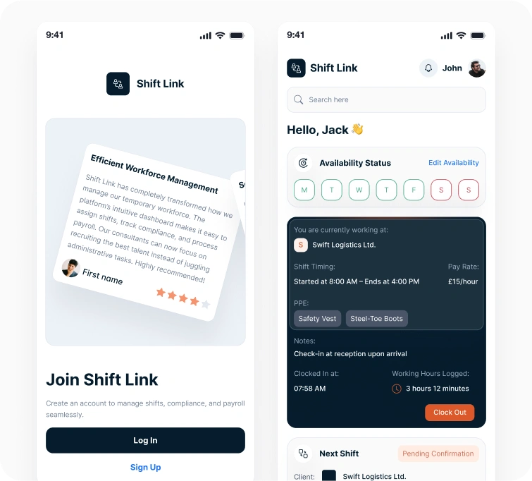Hashlogics developed Shiftlink, an AI-augmented workforce management platform designed to simplify compliance tracking, shift scheduling, worker registration, and payroll processing. Built for recruitment consultants and administrators in regulated sectors such as healthcare and logistics, Shiftlink supports mobile and desktop use, featuring real-time dashboards, margin forecasting, and worker self-service portals. Leveraging Next.js and Supabase, the platform ensures streamlined, transparent, and scalable operations.
